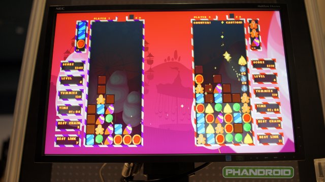 I planned on playing a quick game to get the feel of Yummy Circus. I lost, but felt I was finally getting the hang of it, so played once more. I lost again, demanded two more rematches, and lost both times. I was playing one of the game’s creators so I didn’t feel as bad, but the point is that I was quickly sucked into the game. It’s simple, yet addictive, and multi-player mode is a blast (we played locally with 4 people). In multi-player mode, the treats you combo get sent to your competitors as dead blocks of chocolate, clearable only by making a combo on adjacent blocks.